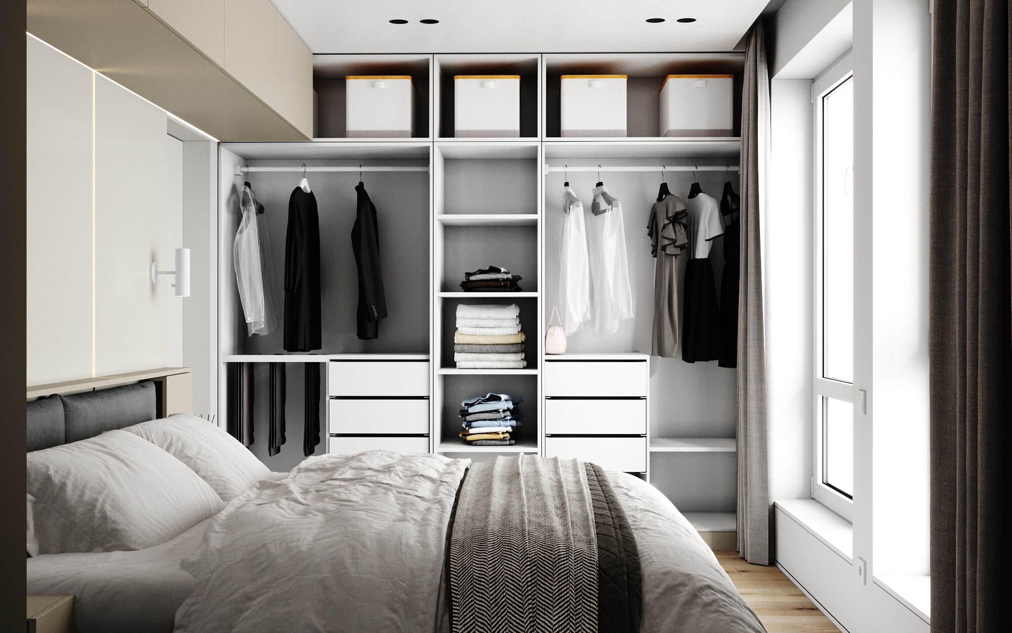 Ідеальним рішенням у такому випадку є гардеробна. Типова думка, про те, що гардеробна кімната є доцільною для квартир з великою площею, є хибною. Адже, завдяки якісному плануванню облаштування житла, можна оптимізувати розміщення гардеробної у приміщенні будь-якого розміру.